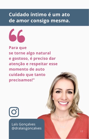 Cuidado íntimo é um ato de amor consigo mesma. Para que se torne algo natural e gostoso, é preciso dar atenção e respeitar esse momento de auto cuidado que tanto precisamos!" Laís Gonçalves @dralaisgoncalves 17
